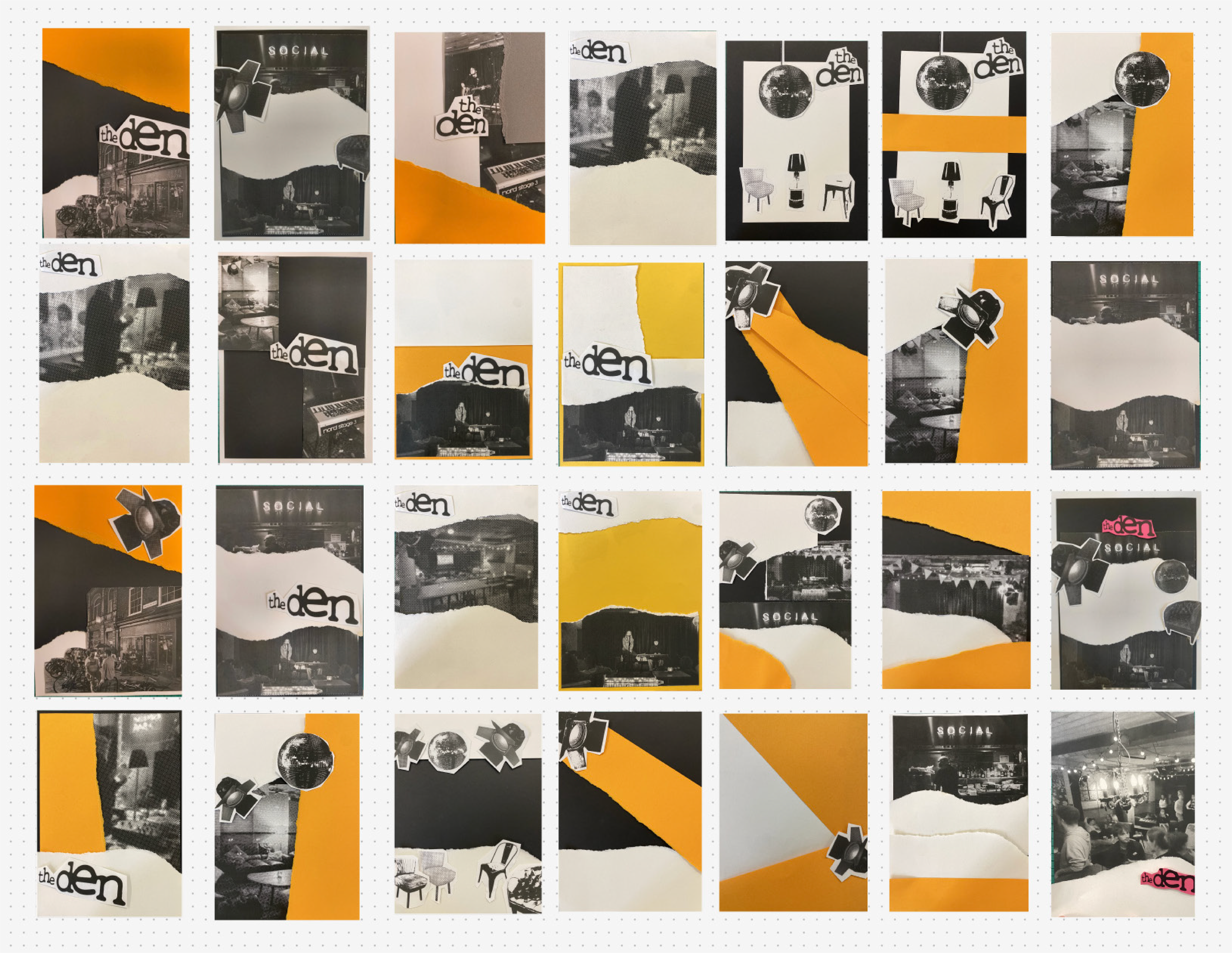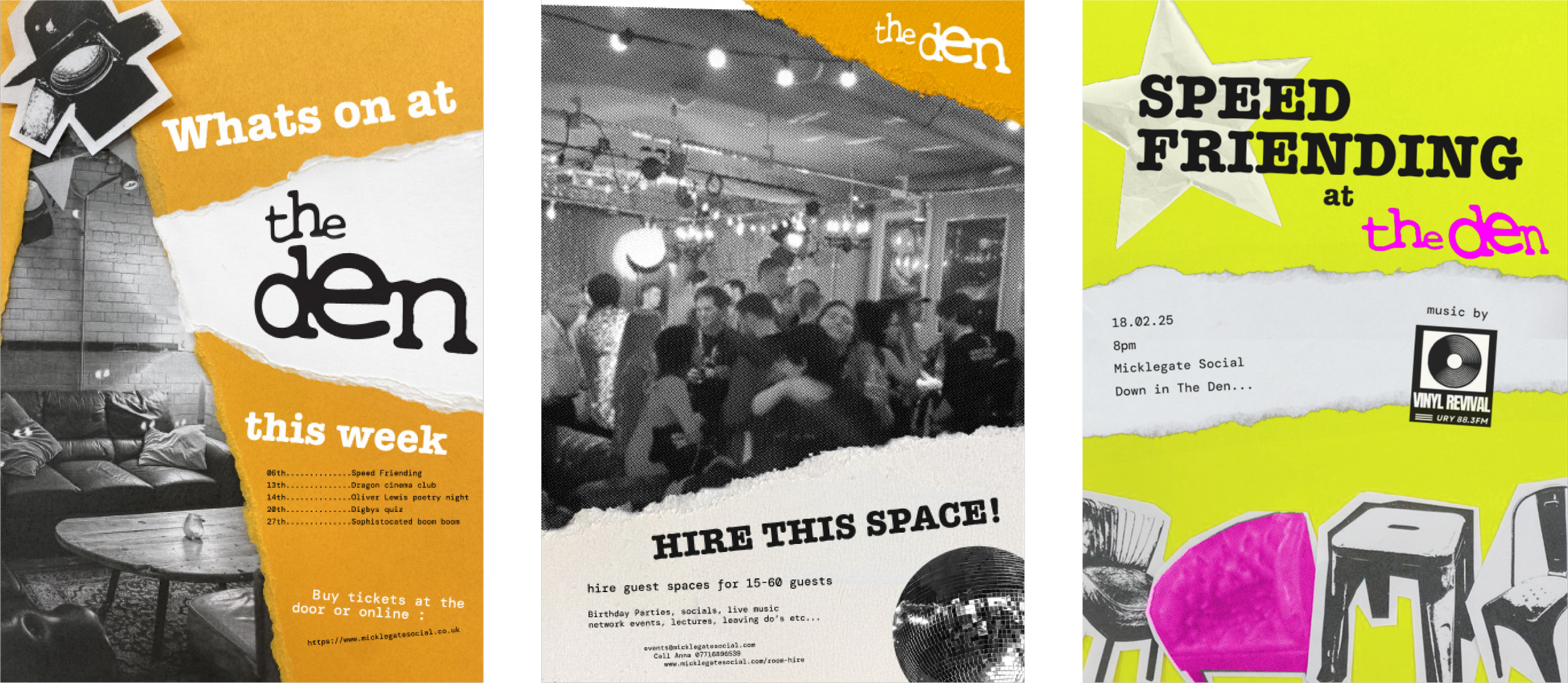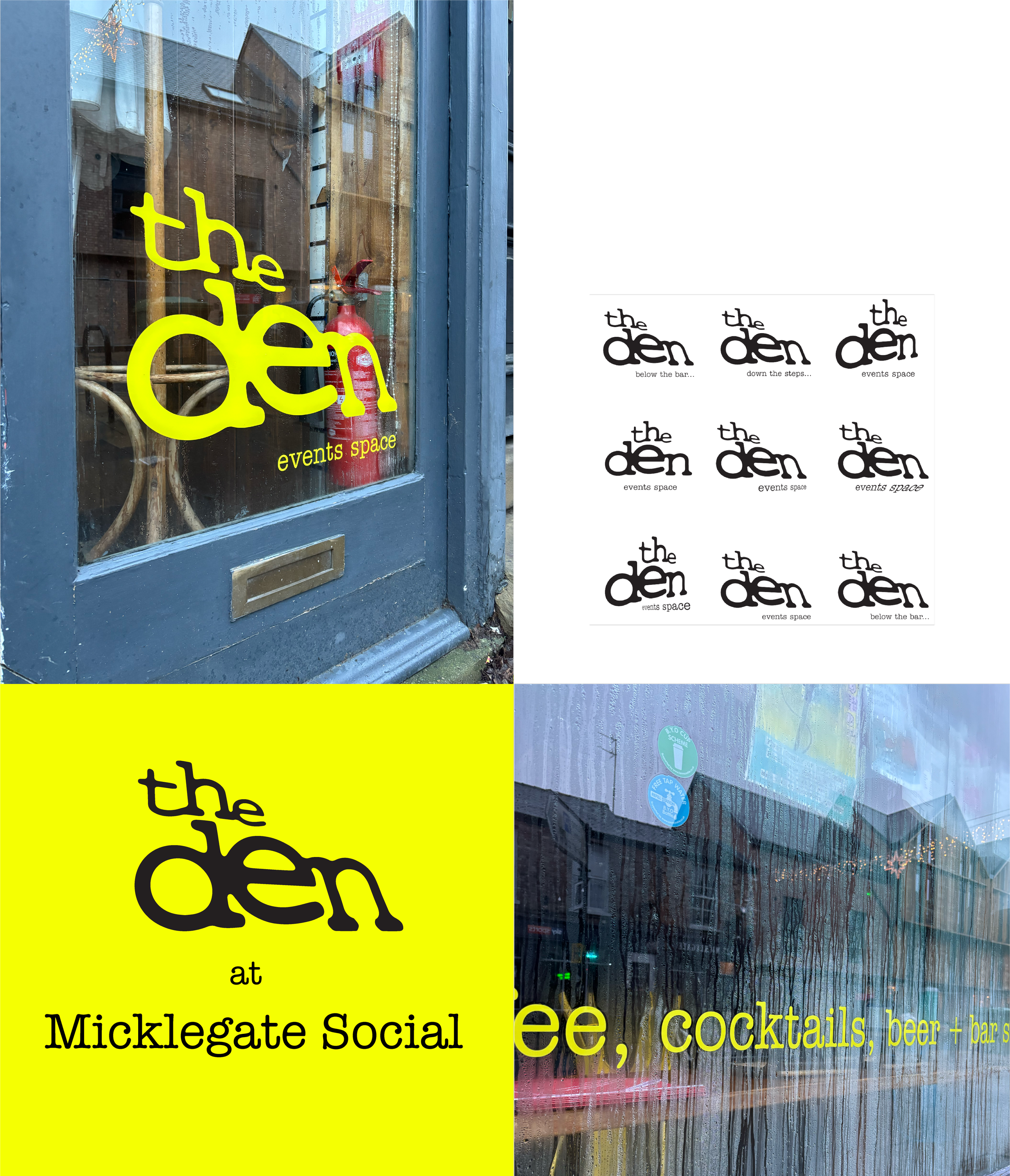 The Den is a live music and events space located within Micklegate Social in York. Due to inconsistent promotion, the space lacked a clear and recognisable identity. This project aimed to establish The Den as a distinct entity while remaining visually connected to the existing Micklegate Social brand.